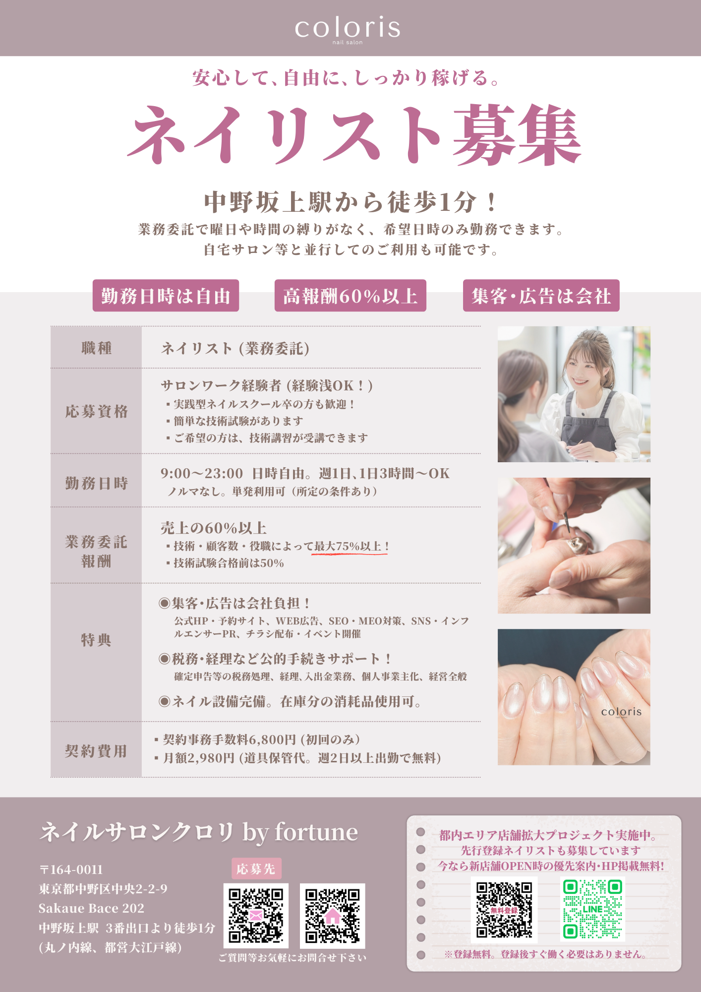 ※登録後すぐ働く必要はありません。無料登録で新店舗情報などのネイリストお得情報を優先的にお知らせします。